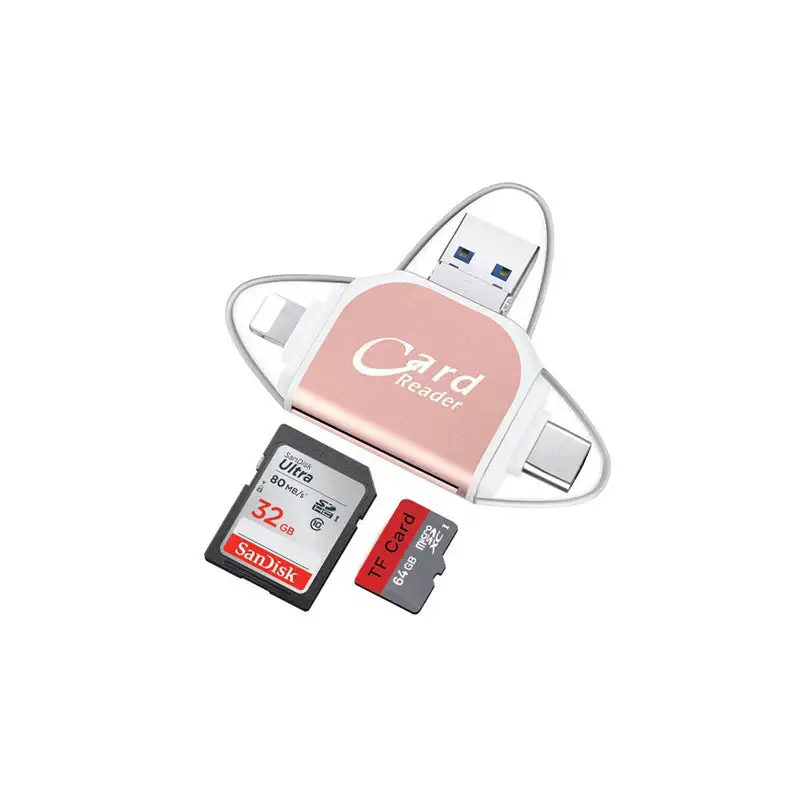 Med denne 4-i-1-kortlæser kan du hurtigt flytte fotos, videoer, musik og dokumenter mellem din telefon, tablet og computer. Med flere porte og et kompakt design er det det ultimative alt-i-et-værktøj til at håndtere dine data på farten.