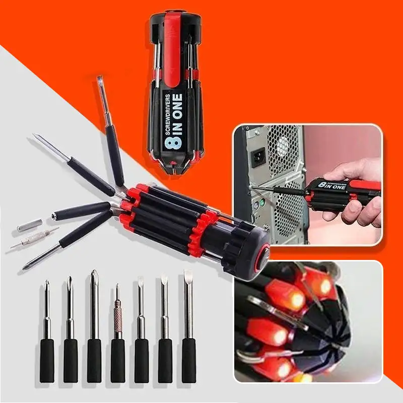Det multifunktionella verktyget är en 8-i-ett skruvmejselsats med en inbyggd kraftfull 6-LED-ficklampa. Oavsett om du fixar något hemma, arbetar i trånga utrymmen eller är på språng, ger det här verktyget dig den bekvämlighet, synlighet och prestanda du behöver – allt i fickan.