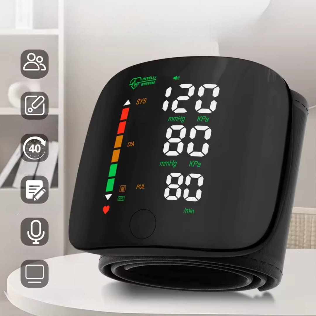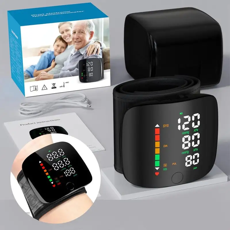 A wrist blood pressure monitor that provides fast and clear readings at home or on the go. It features a large LED display, color-coded results, and simple one-button operation for easy use. Compact and rechargeable, it helps you track your blood pressure conveniently and confidently.